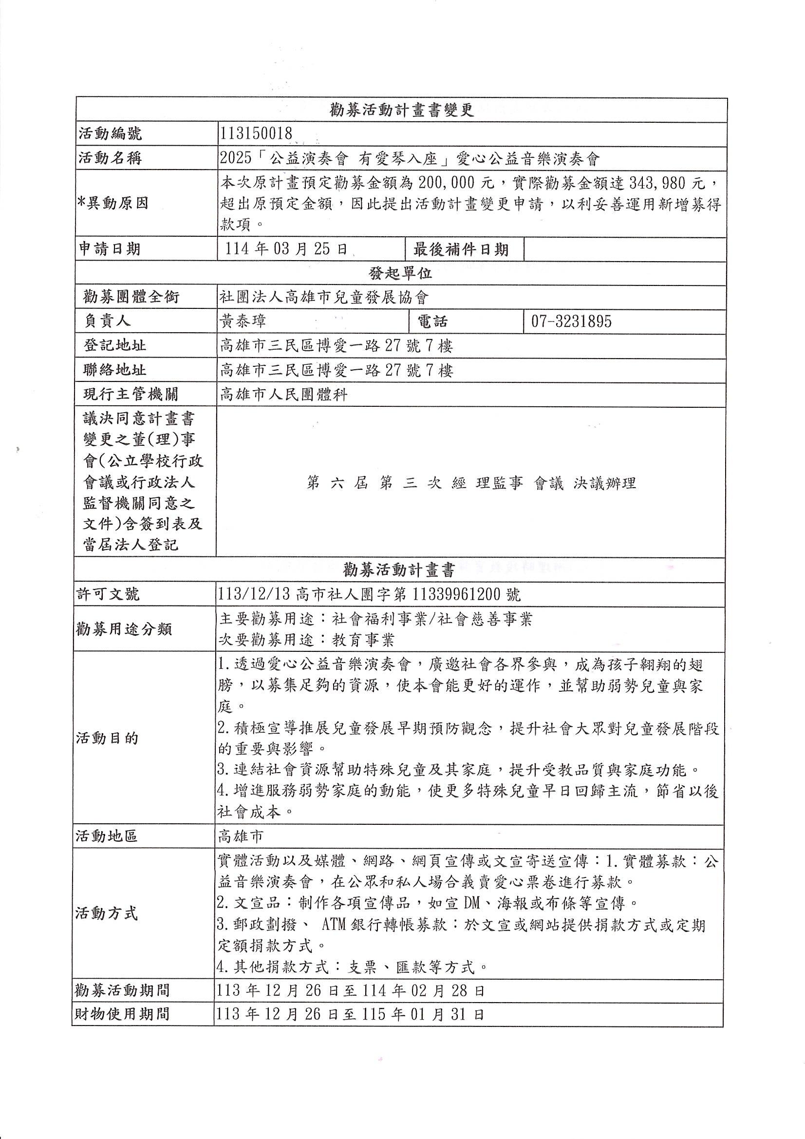 勸募許可字號高市社人團字第11339961200號勸募活動,原預計募款200,000元整,截止勸募活動結束募款總金額為343,980元,因此申請財物使用異動,並依公益勸募許可辦法第六條規定特此公告。