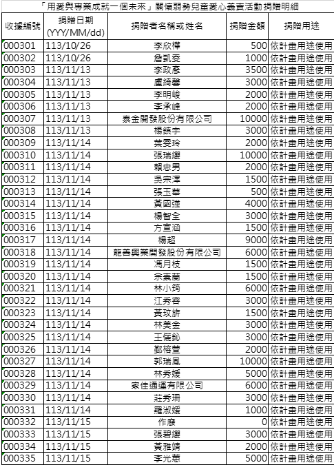 「用愛與專業成就一個未來」關懷弱勢兒童愛心義賣活動實募金額的最新資料
